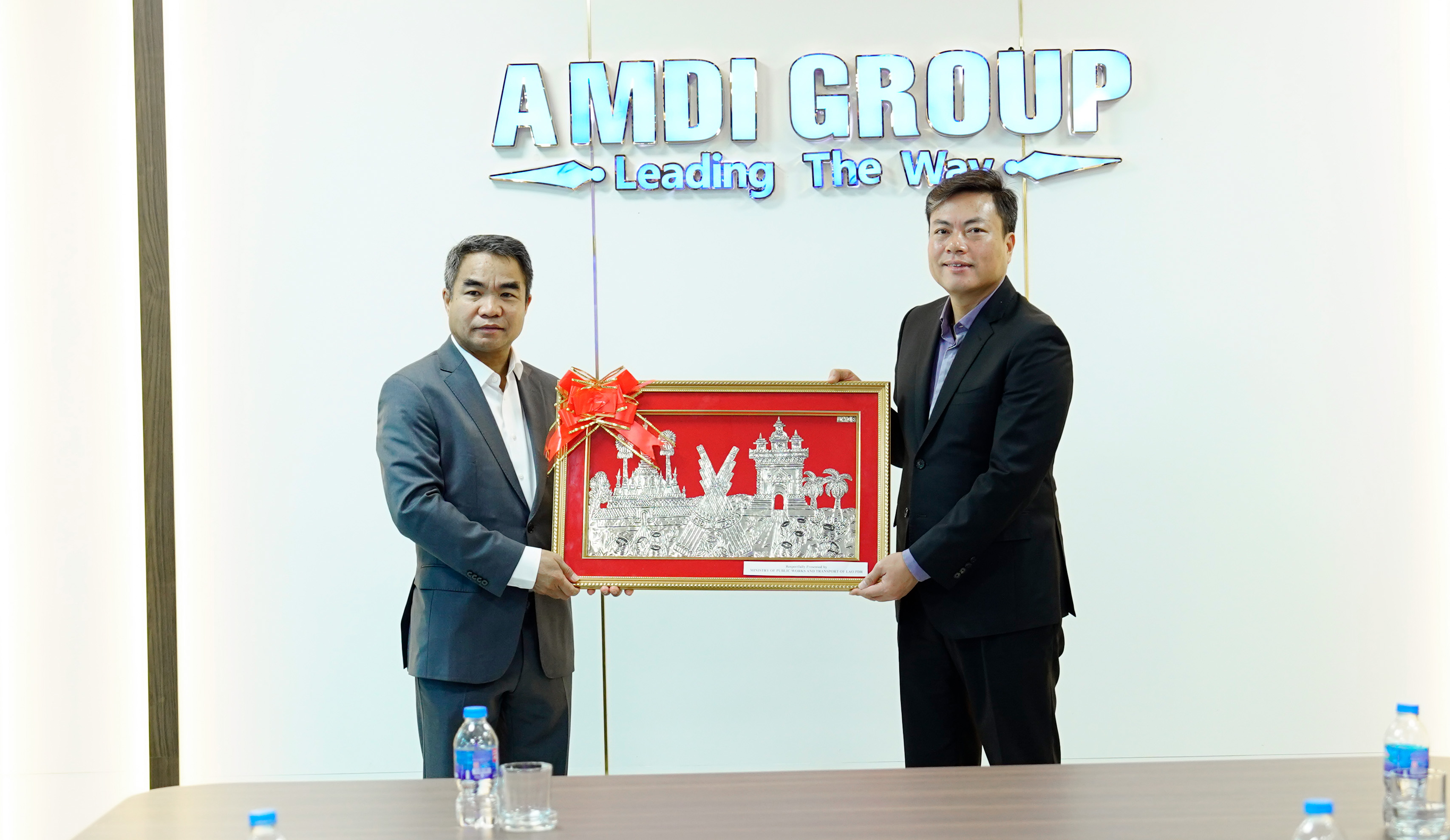 Chủ tịch tập đoàn AMDI, Viện trưởng Viện AMDI nhận quà lưu niệm từ Thứ trưởng Bộ Giao thông và công trình Lào